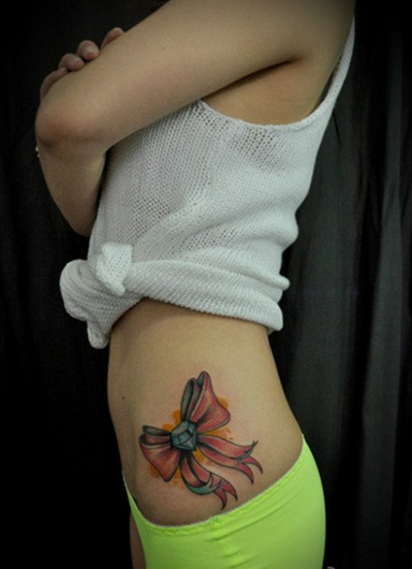 美女侧腰彩色蝴蝶结钻石纹身图案