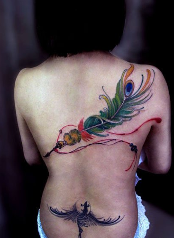 女生后背唯美漂亮的彩色羽毛纹身图案