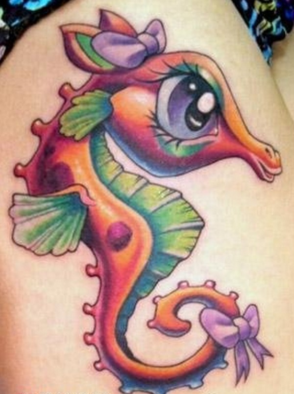 腿部可爱的卡通海马蝴蝶结纹身图案