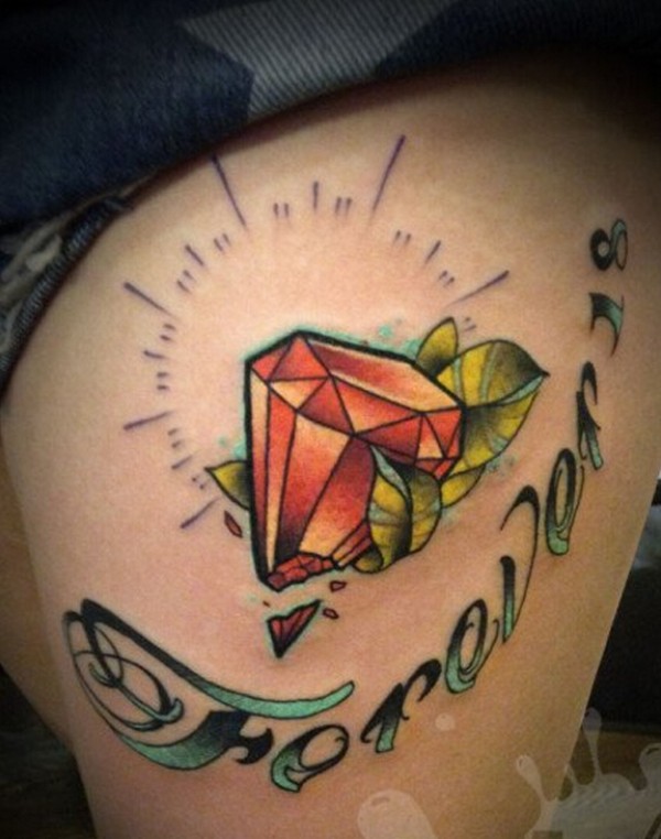 女生腿部个性彩色钻石字母纹身图案