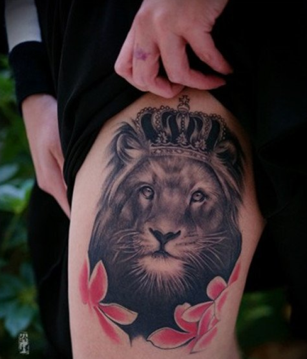 腿部狮子皇冠纹身图案