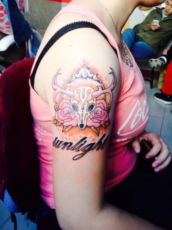 大臂上非常漂亮的藏羚羊英文纹身