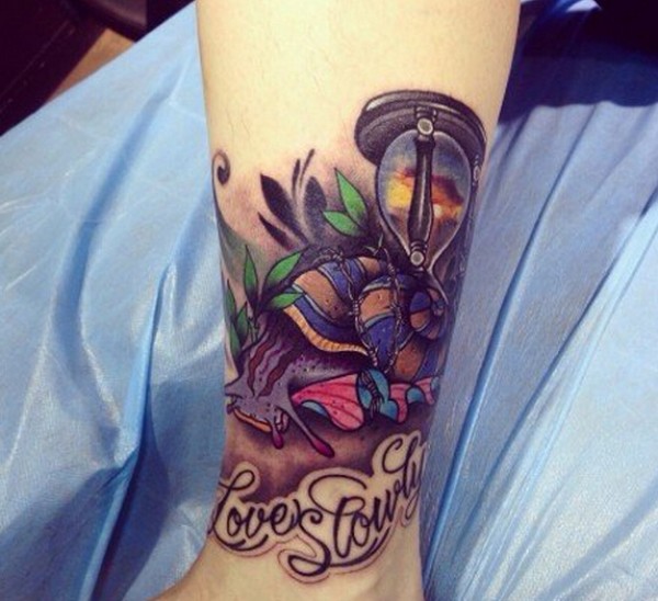 腿部彩色沙漏蜗牛纹身图案