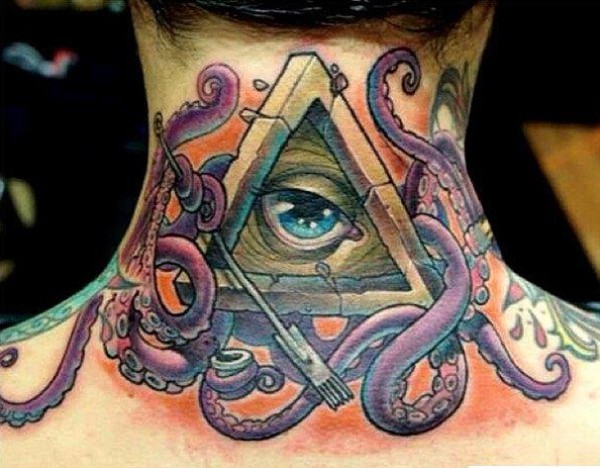 脖子上个性十足的彩色骷髅纹身_脖子纹身图案大全_纹身图吧