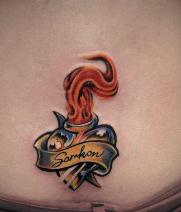 女孩子腰部爱心油灯火焰纹身图案