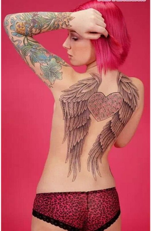 女生背部心形翅膀和花臂纹身