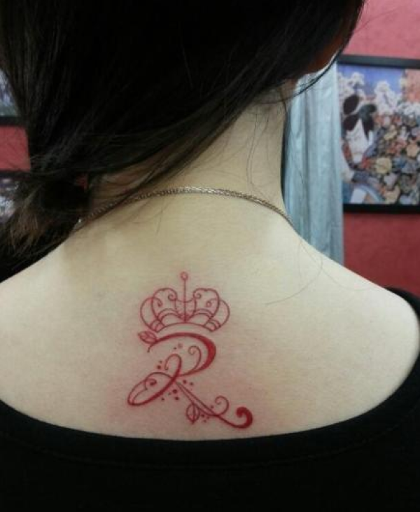 靓妹后背潮流小巧的皇冠字母纹身图案