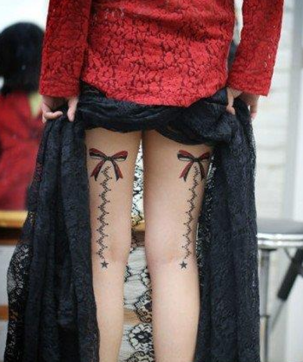 腿上精巧的蝴蝶结与蕾丝文身图片