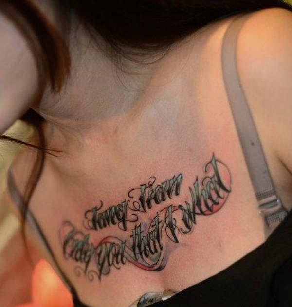 女生前胸精致的奇卡诺花体字母纹身图案