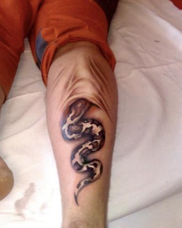 腿部潮流很酷的撕皮蛇纹身