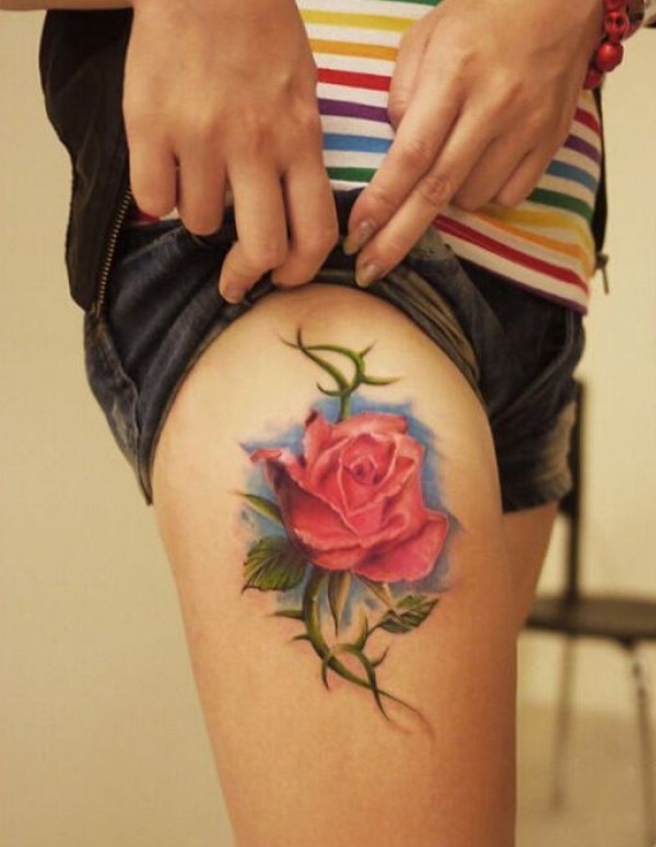 美女腿部漂亮好看的彩色玫瑰花纹身图