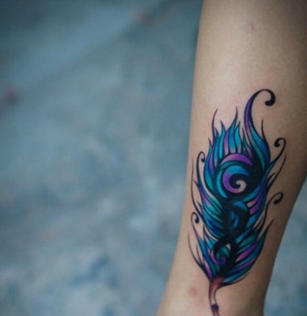 腿部彩色羽毛纹身图案