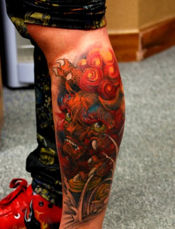 腿部赤红色唐狮纹身图案