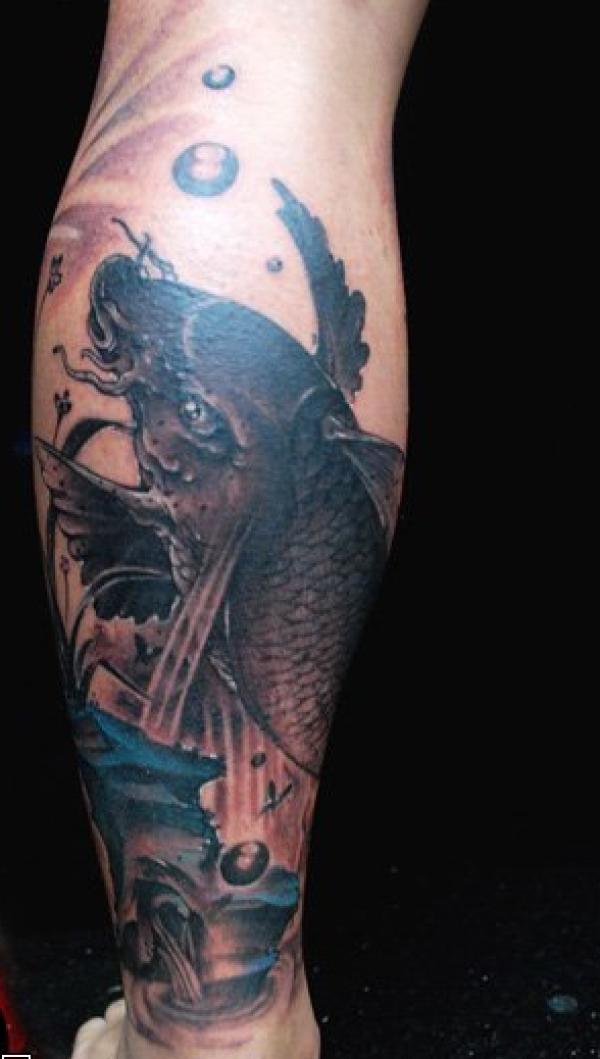 黑色腿部霸气鲤鱼纹身图案