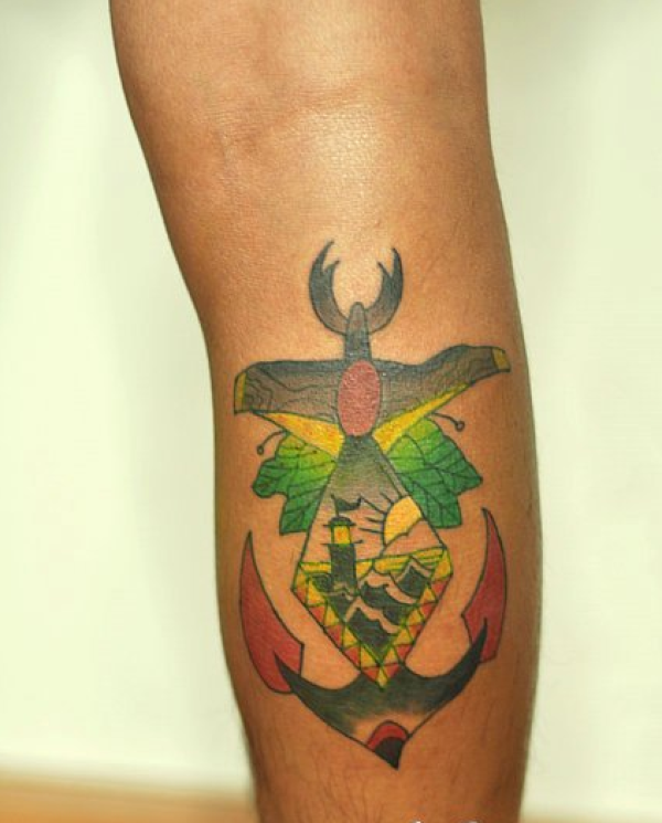 腿部彩色灯塔与日出蝙蝠鱼纹身图案