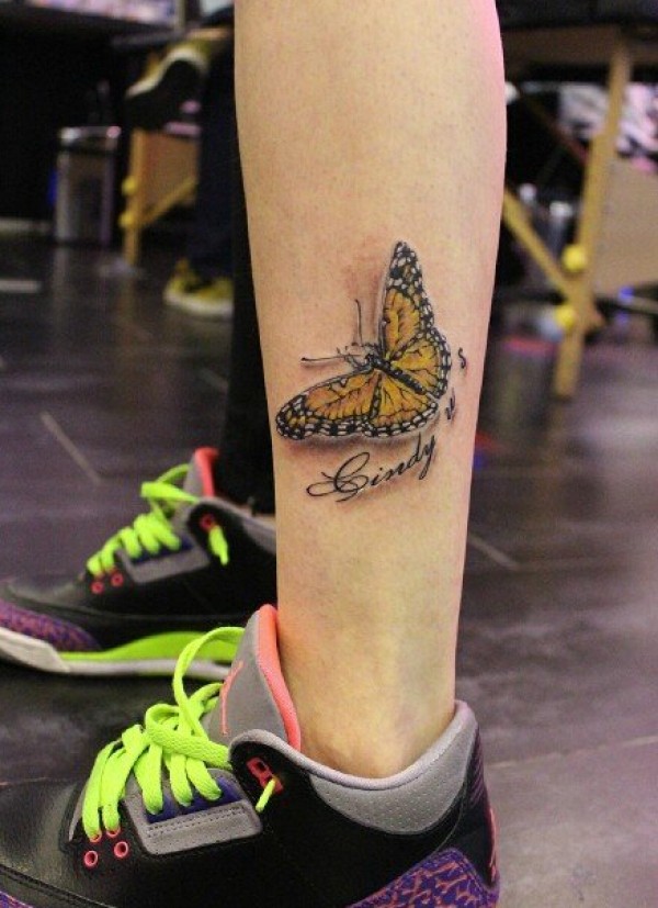 腿部栩栩如生飞翔蝴蝶纹身图案