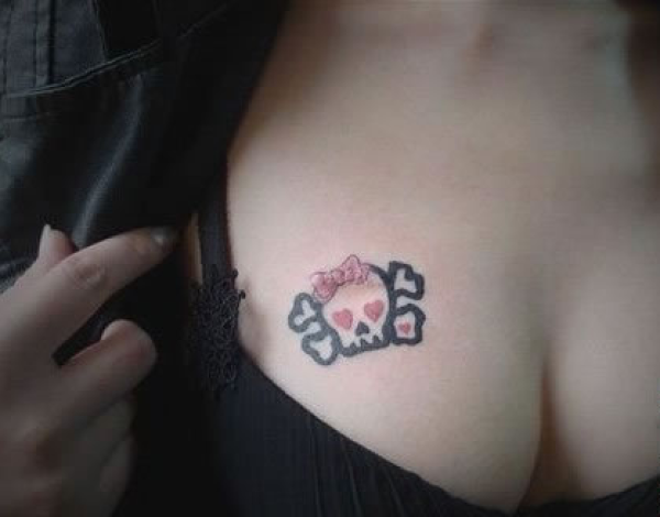 美女胸部头戴蝴蝶结的骷髅头纹身图