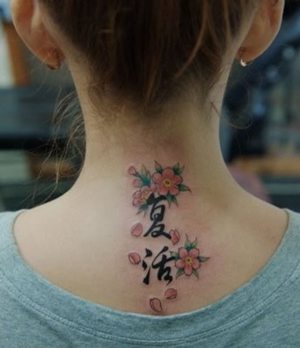 女生颈部浪漫的樱花纹身图案