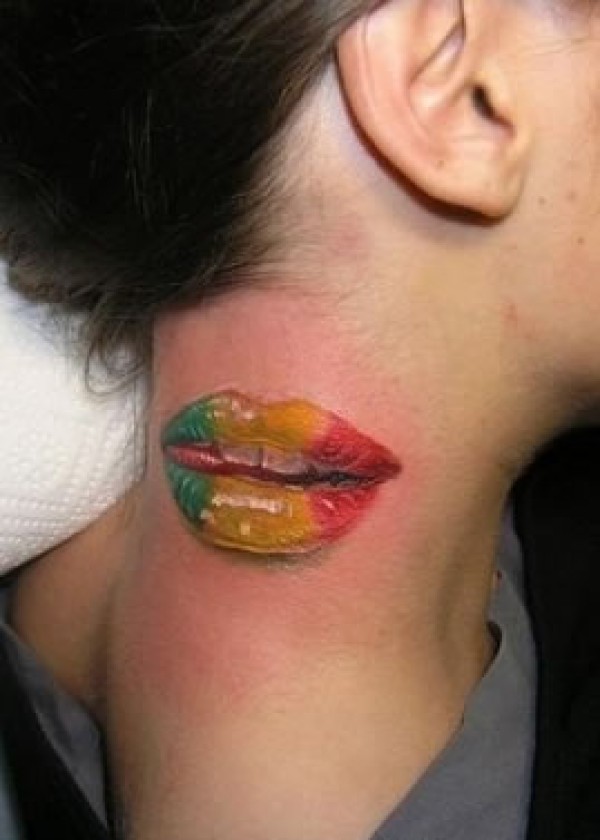 脖子上个性十足的彩色骷髅纹身_脖子纹身图案大全_纹身图吧