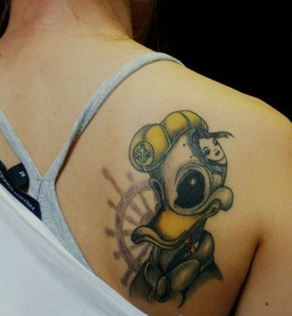 美女后背的彩色唐老鸭纹身