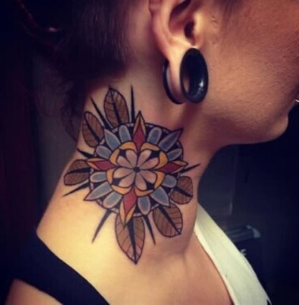 美女颈部大型彩色花朵纹身图