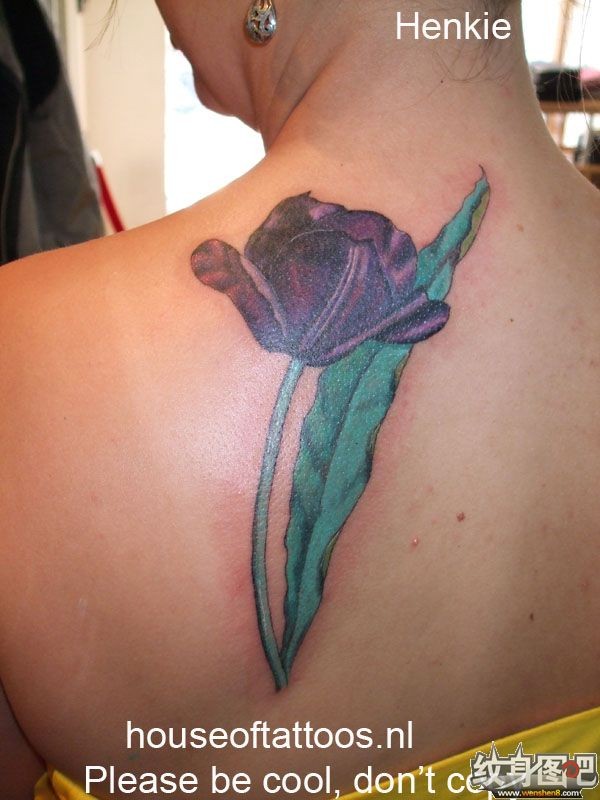 背部紫色花朵纹身