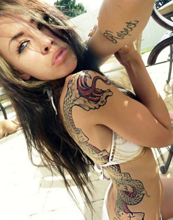 半裸美女展示性感满背纹身