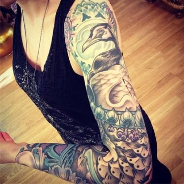 美女孔雀花臂纹身