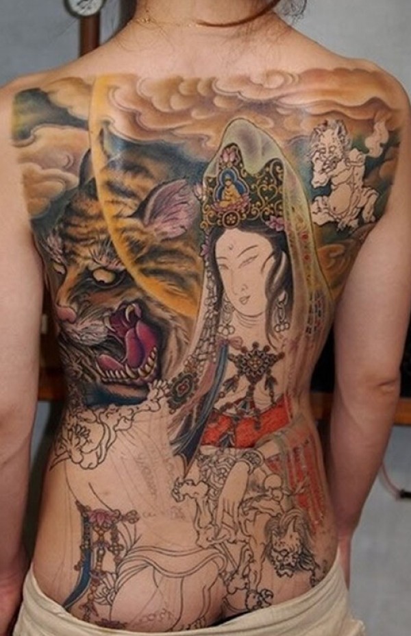 女生满背经典菩萨纹身