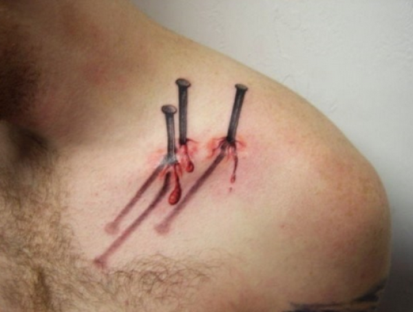 肩膀上3d效果的钉子纹身