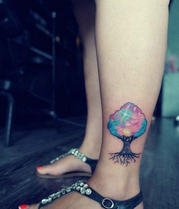 女生脚踝彩色星空树纹身图案