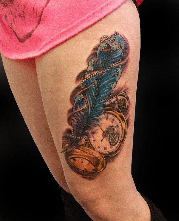 大腿上个性的羽毛怀表纹身