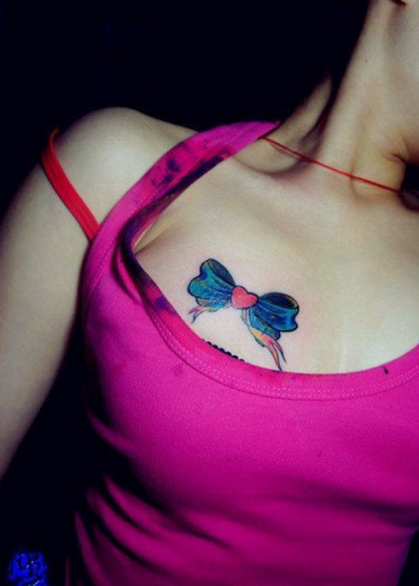 美女胸前小巧潮流的蝴蝶结纹身图片