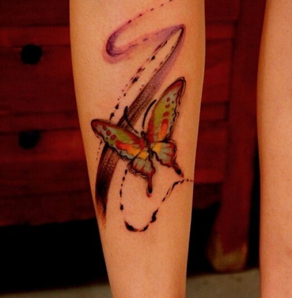 腿部彩色水墨蝴蝶纹身图案