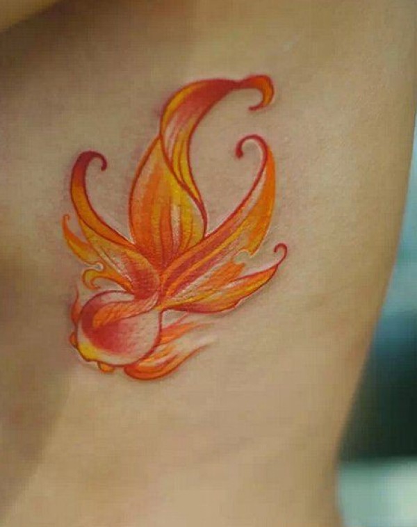 女生侧腰暖色金鱼纹身图案