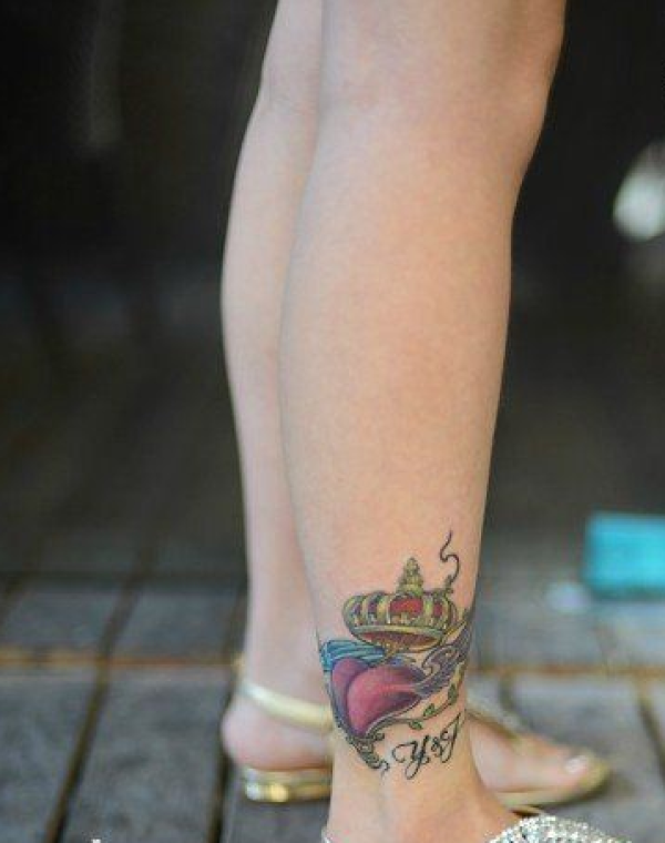 女性脚踝处小巧潮流的爱心皇冠纹身图片