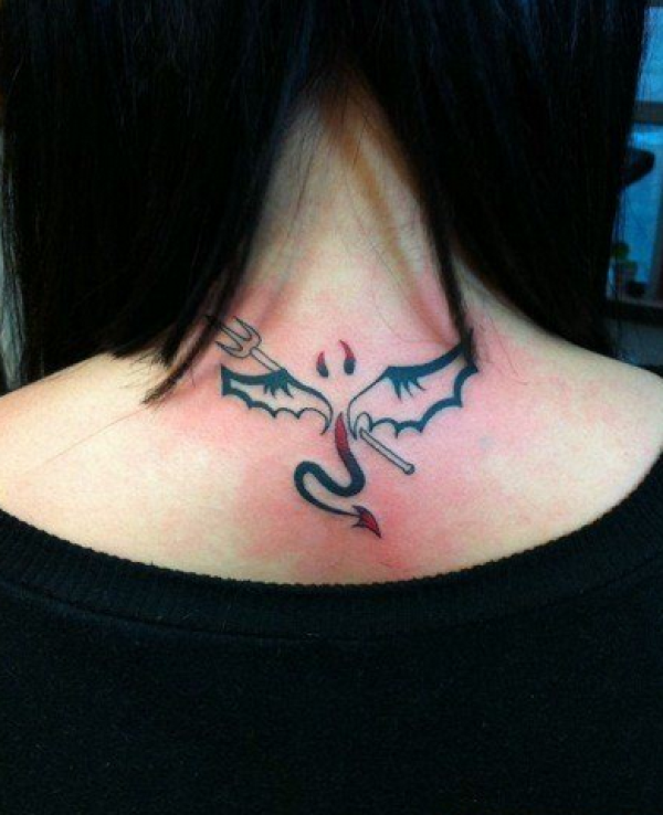 女性颈部小巧潮流的恶魔翅膀纹身图片