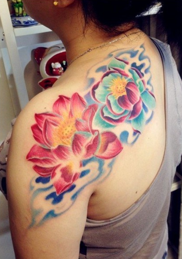 女生肩花纹身_15张女性双肩对称的肩花纹身图案作品图片