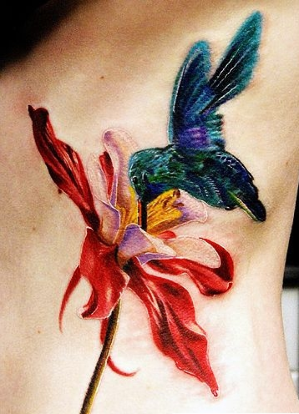 腰部纹身图案彩色3D花卉小鸟纹身图案