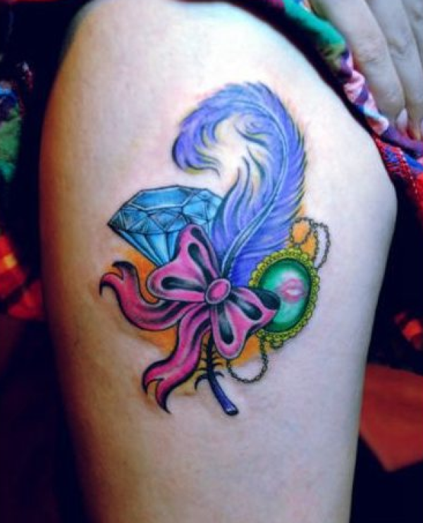 靓女腿部羽毛钻石与蝴蝶结纹身图案