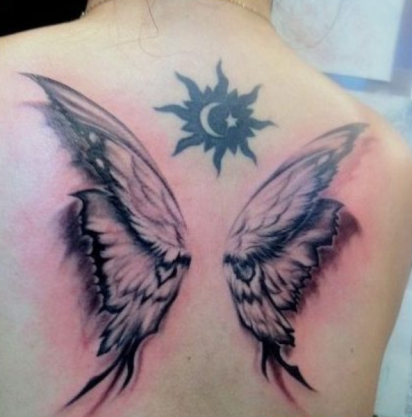 女性背部时髦精致的蝴蝶翅膀纹身图案