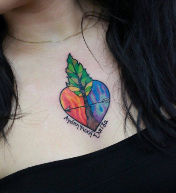 美女前胸漂亮爱心与小树纹身图案
