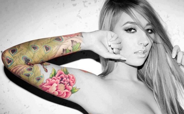 美女花臂孔雀羽毛花卉纹身