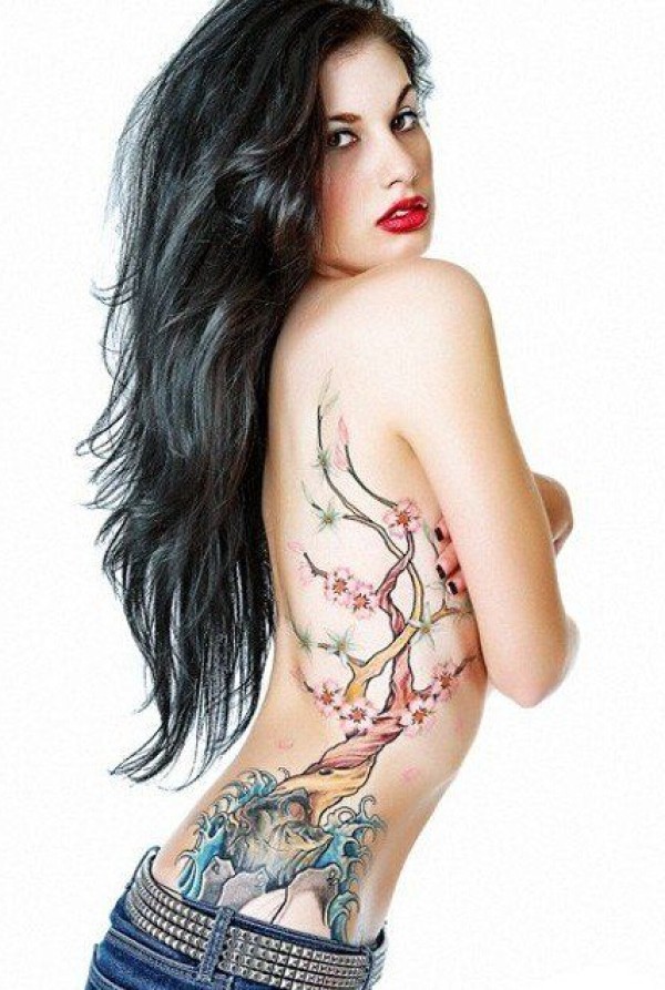 美女侧腰树文身作品