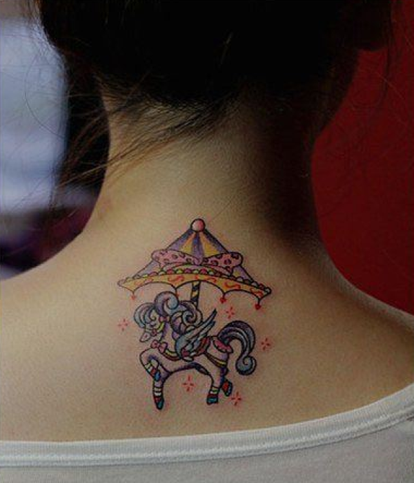 女生颈部小巧的旋转木马纹身图案