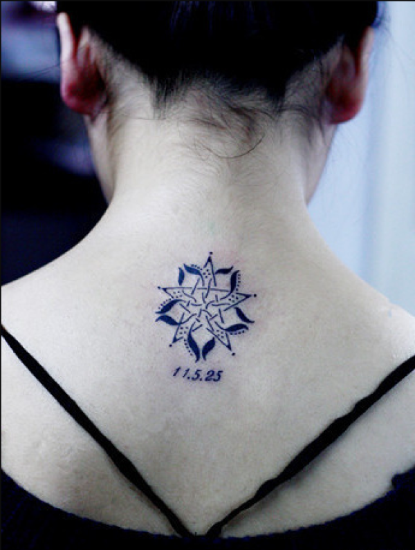 女生后背蓝色五星芒纹身