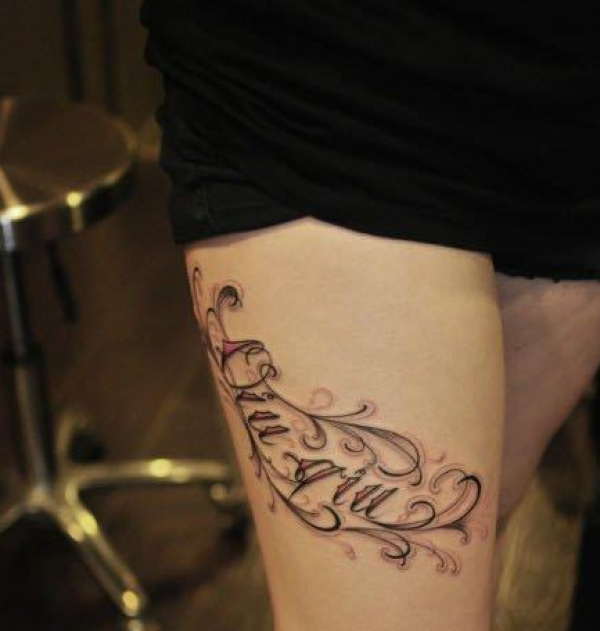 女生腿部好看前卫的花体字母纹身图案
