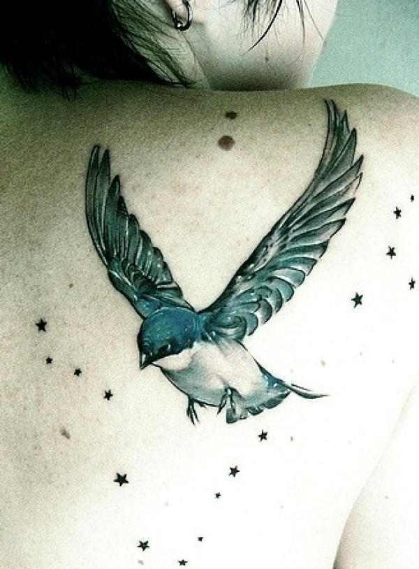 女生背部飞翔的小鸟纹身