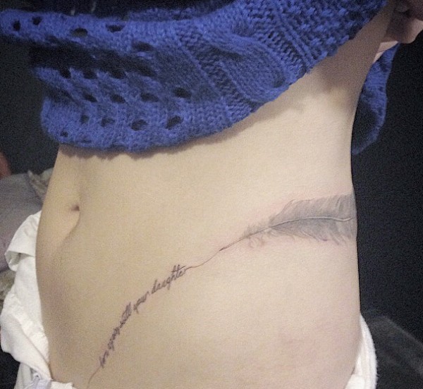 美女腰腹上简单漂亮的英文和羽毛纹身