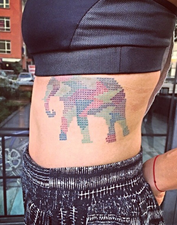 女生腰部大象十字绣纹身图案